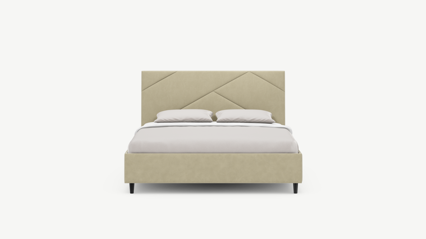 Элегантным и практичным акцентом служат скрытые карманы, расположенные по его углам. Лаконичные формы объемных царг создают единый гармоничный образ и фокусируют внимание на центральном текстурном элементе кровати.
