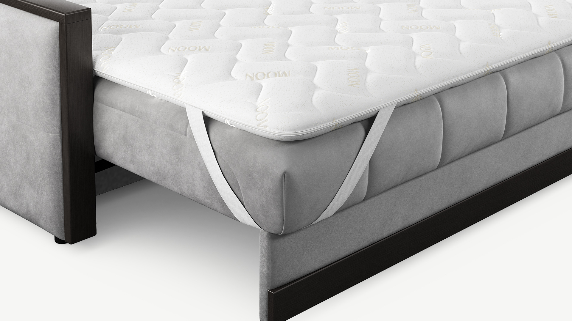 Топпер можно использовать как на диване, так и на матрасе. Фиксация на поверхности спального места осуществляется с помощью широких резинок в четырех угловых точках.