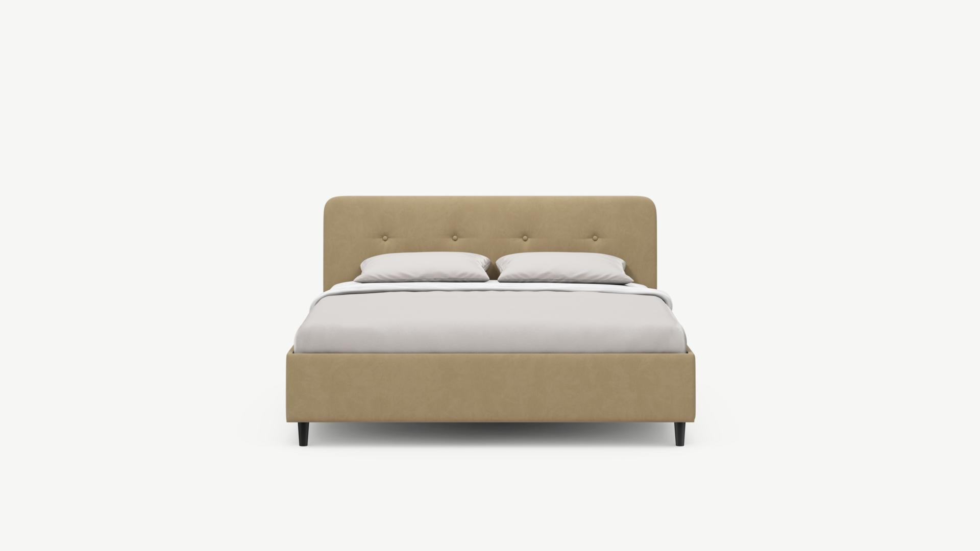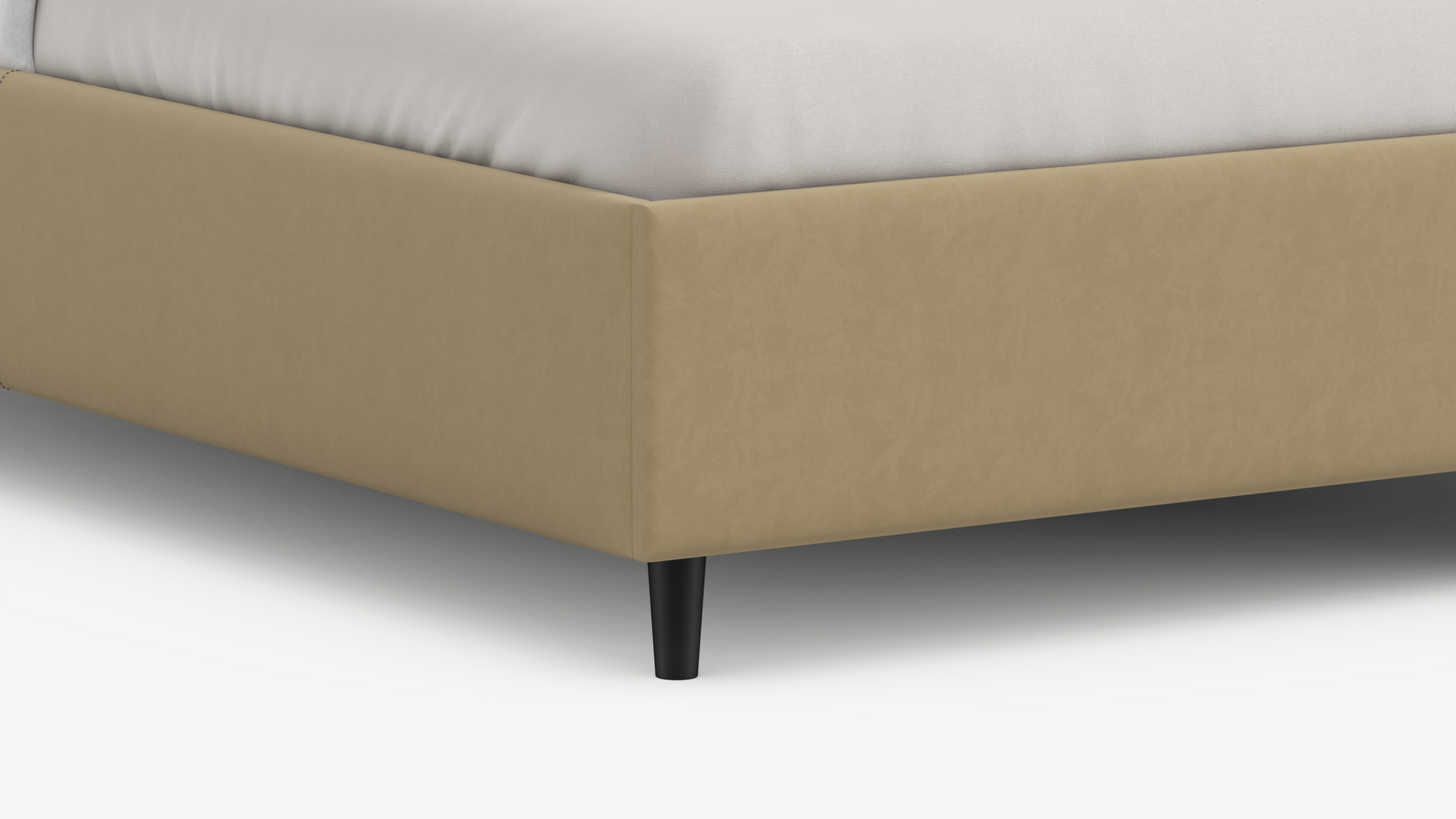 Царга, задающая пропорции, благодаря гладкости своей фактуры подчеркивает центральный элемент декора. Высокие опоры приподнимают фигуру кровати над полом и добавляют её образу визуальной легкости.