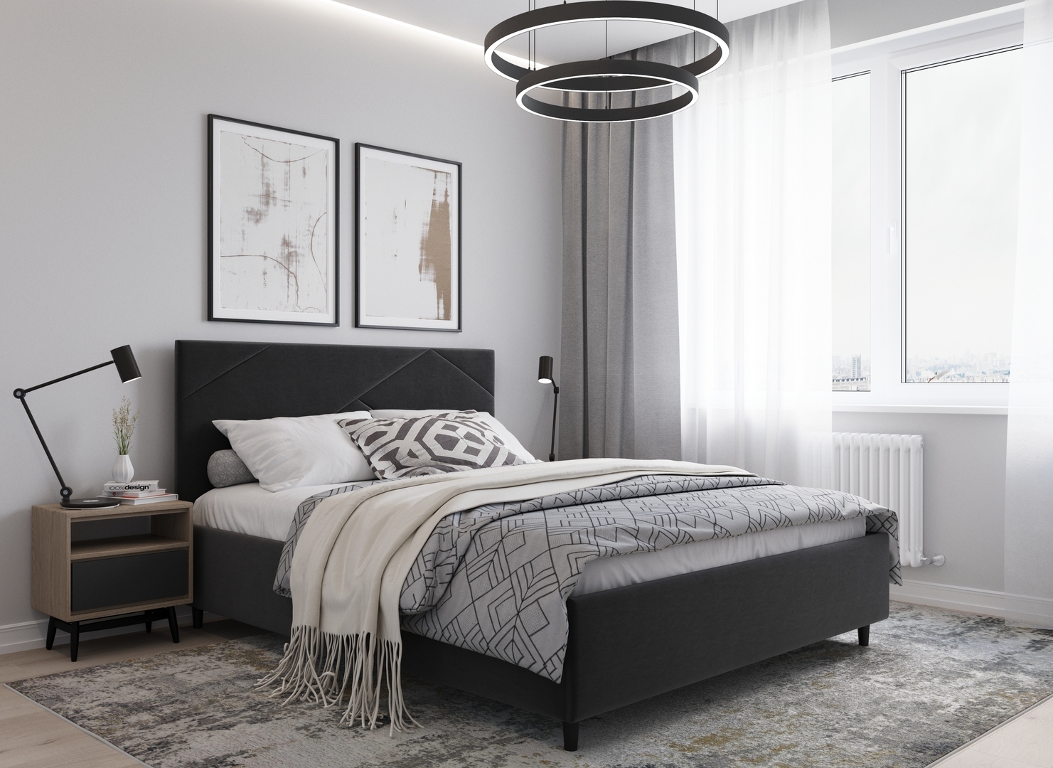 Элегантным и практичным акцентом служат скрытые карманы, расположенные по его углам. Лаконичные формы объемных царг создают единый гармоничный образ и фокусируют внимание на центральном текстурном элементе кровати.