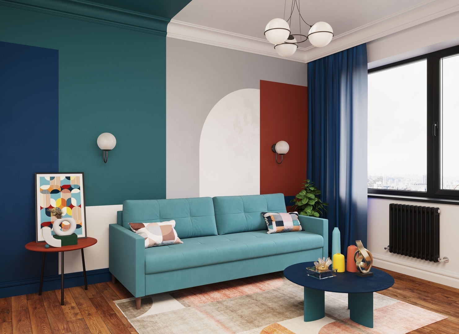 Спинка, выполненная в обивочной ткани, позволяет ставить диван в центре комнаты и зонировать пространство.