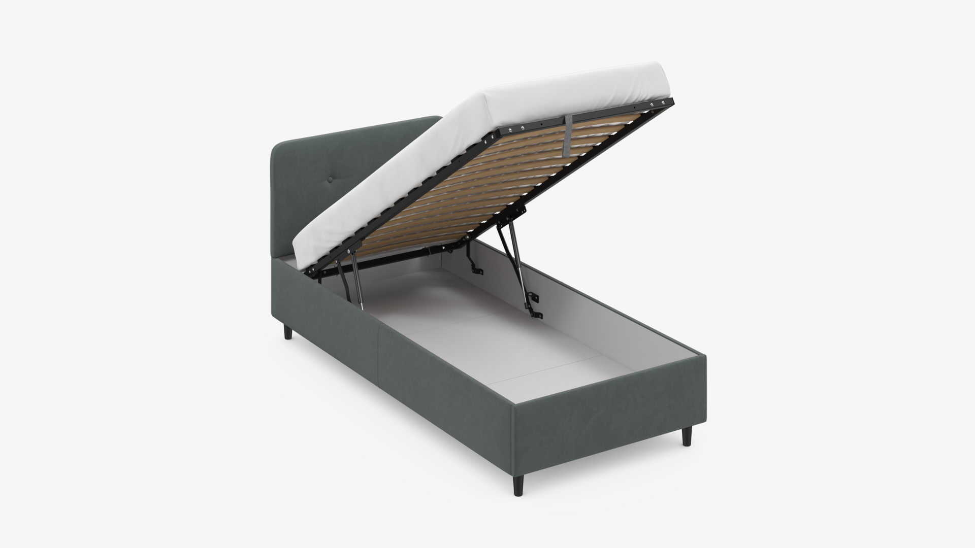 • Скрытая под основанием вместительная емкость без внутренних перегородок позволяет использовать всю площадь подкроватного пространства для хранения вещей.