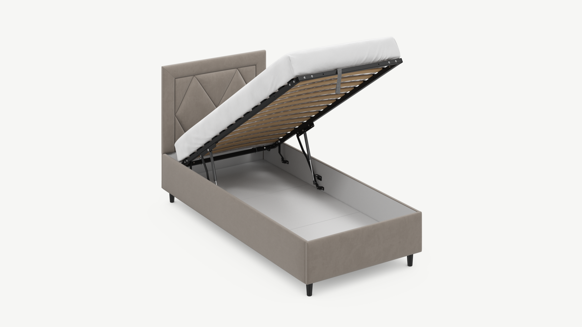 • Скрытая под основанием вместительная емкость без внутренних перегородок позволяет использовать всю площадь подкроватного пространства для хранения вещей.