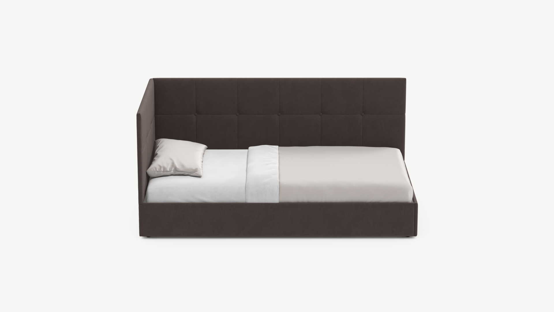 Угловая односпальная кровать MOON FAMILY 1261 с мягкой спинкой и изголовьем создаст в Вашей спальне ощущение уюта. Крупная квадратная стежка привносит в интерьер графических акцентов, а вставка из пуговиц наполняет пространство ощущением домашнего тепла.