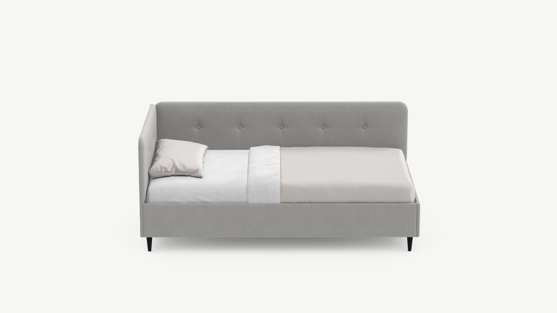 Угловая односпальная кровать MOON FAMILY 1253 с мягкой спинкой и изголовьем обладает округлыми формами, привносящими в интерьер нотки нежности. Изголовье, украшенное пуговицами, добавляет окружающему пространству шарм и уют. Высокие опоры придают кровати визуальной легкости, а также обеспечивают удобство во время уборки.